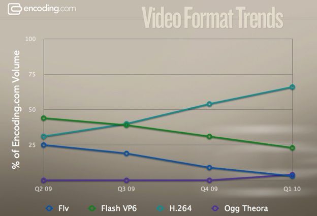 TechCrunchの記事によるとEncoding.comのエンコード状況を調べた結果、Appleが開発し、iPhoneなどに採用されているH.264へのエンコードが増加し、フラッシュへのエンコードが減少しているようです。