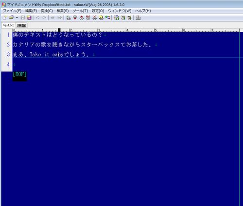 ファイルを開いた後、日本語での編集や保存ができるようになります。ただしファイルの新規作成はできませんし、編集できるのはテキスト系のファイルだけです。(Wordのdocファイルなどバイナリ・ファイルはダメです)
