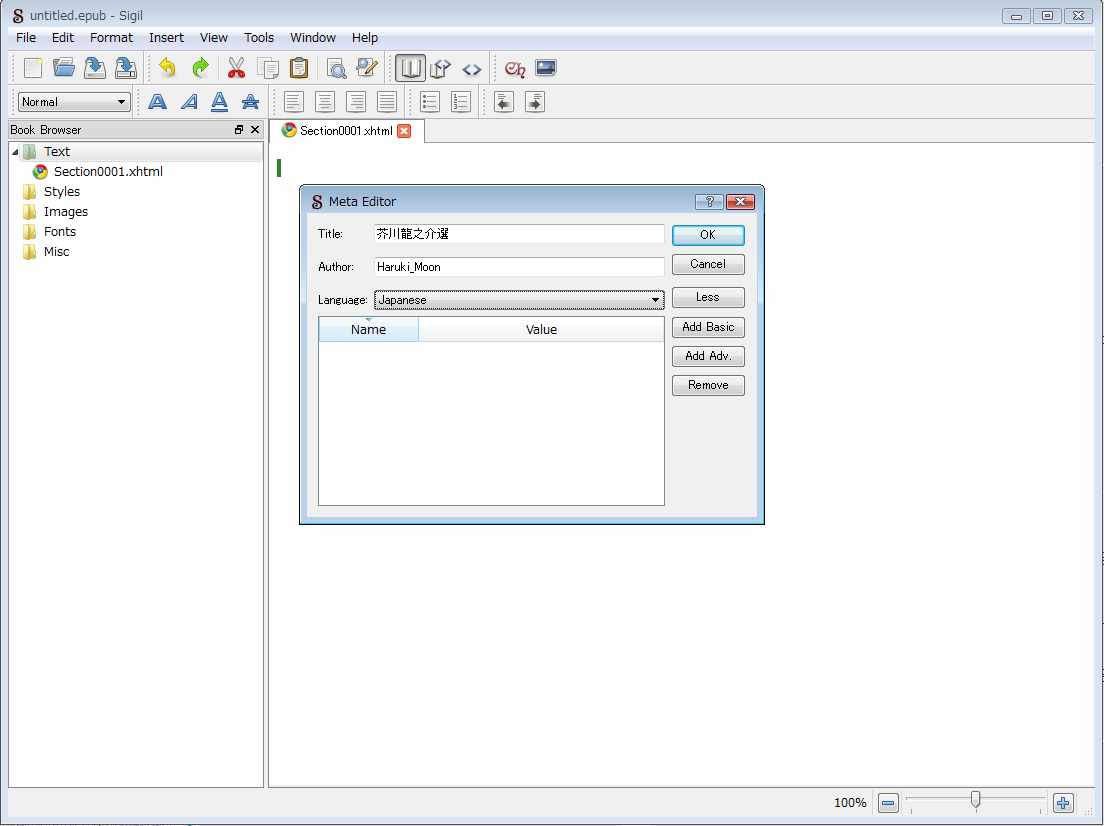 最初に作詞する電子ブックの情報を入力します。メニューのToolのMeta Editorを選択すると次のような画面がポップアップしますので、情報を入力します。 Add BasicボタンでISBNなどを入力できますが、流通させるものではないので今回はタイトル、作者、言語のみ入力します。
