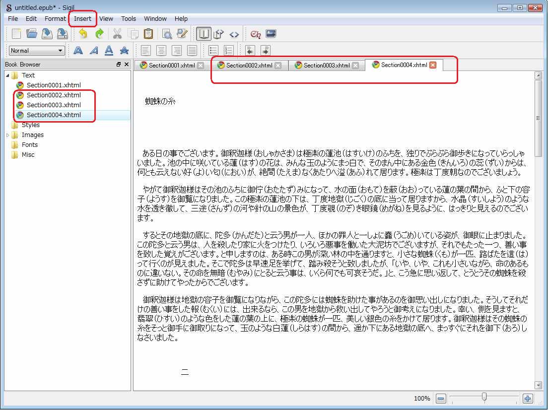 上の状態では章区切りがないので、章を区切っていきます。文章内の区切りたい部分(各本文の後と次のタイトルの間)にカーソルをおいてメニューのInsertのChapter BreakをクリックするとSection0002.xhtmlが分割され、新しくSection0003.xhtmlとSection0004.xhtmlが作成されます。
