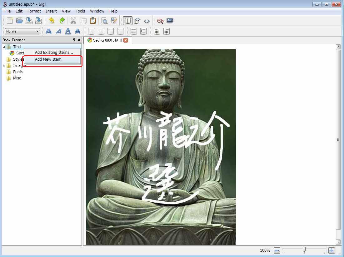 表紙になる画像が挿入されたら、次に左のTextを右クリックして、Add New Itemで電子ブックの中身となるSection0002.xhtmlを新規作成します。