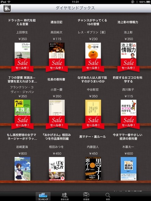 まだまだ少ない状態ですが、これからドンドン充実していくことはまちがいありません。特にこの出版社はドラッカー、7つの週間など経営・自己啓発系の出版物が多いことから、ビジネスマンには要チェックの電子書店です。
