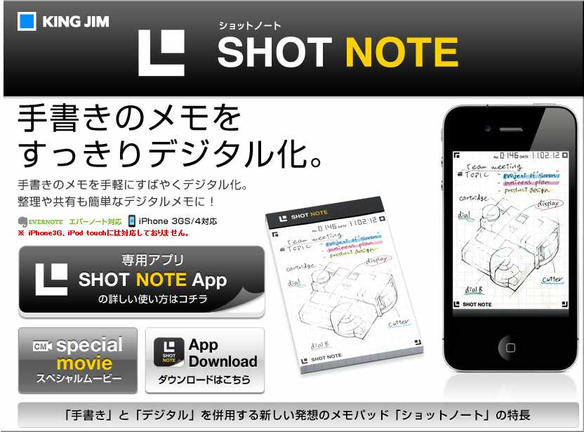 キングジムのショットノートは専用のメモ用紙に書いたメモを、これまた専用のアプリでiPhoneに読み取り保存するというものです。EvernoteへのエクスポートへもOKですから、メモを電子的に保存する環境としてはバッチリです。