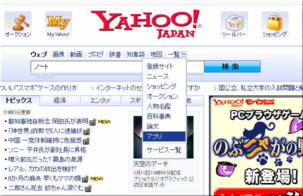 Yahoo検索のオプションで、一覧からアプリを選択しますと、iPhoneやiPadアプリを探し出すことができます。