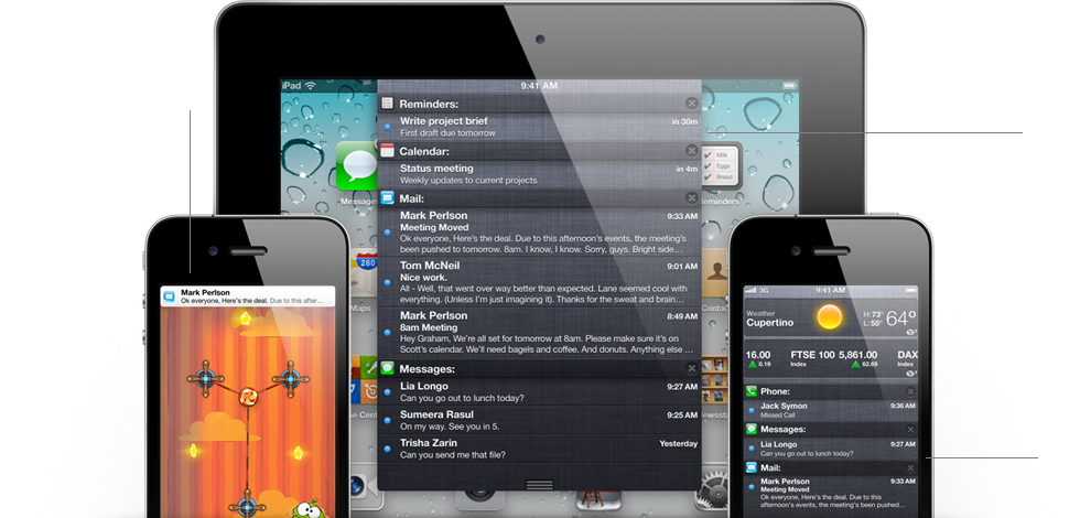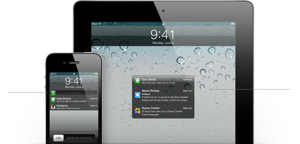 ⇒Notification Centerは、テキストメッセージ、不在着信、カレンダーアラート、アプリケーションアラートなどの通知のすべてを、一カ所で、iOS 5の中のどこからでも簡単にアクセスできる革新的な方法を、iOS 5のユーザに提供します。デバイスに通知が届くと、スクリーンの上部に短時間だけ現れ、作業を妨げることはありません。一回スワイプするだけで、すべての通知を見ることができ、軽くタップすると、そのアプリケーションが起動し、より詳しい内容を見ることができます。通知はロックされたスクリーンにも現れ、一回スワイプすると、通知のあったアプリケーションを起動できます。