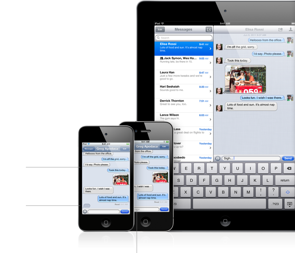 ⇒OS 5に含まれるiMesssageは、iPhoneメッセージの機能性を、iPhone、iPadおよびiPod touchなど、お持ちのすべてのiOSデバイスに提供します。Messagesアプリケーションに組み込まれたiMessageを使うと、他のiOS 5デバイス上の人やグループにWi-Fiまたは3Gを通じて、テキストメッセージや写真、ビデオまたは連絡先情報を簡単に送ることができます。iMessageはすべてのiOS 5のデバイスに自動的にプッシュされるため、iPhone、iPadおよびiPod touch間で一つの会話を維持することが簡単にできます。iMessageはまた、配信通知と既読通知、入力中表示、そして安全なエンド・トゥ・エンドの暗号化といった機能も持っています。