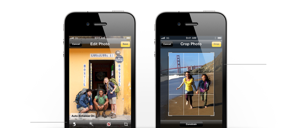 ⇒カメラおよび写真アプリケーションの新機能を使うと、ロックスクリーンから瞬時にカメラにアクセスすることができ、音量アップボタンを使って、素早く写真を撮ることができます。オプションのグリッドラインを使うとラインに沿って構図を決めることができ、一回タップすると一つの被写体上にフォーカスと露出をロックすることができます。新しい写真アプリケーションでは、切り取り、回転、エンハンス、赤目除去をすることができ、撮った写真をデバイス上でアルバムに整理して、外出先からでも共有することができます。