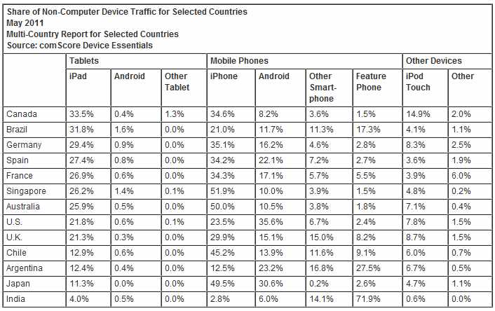 comScoreが5月のウェブにおけるPC以外のモバイルデバイス(タブレットや高機能携帯電話など)のトラフィック調査(各デバイスのシェア)を発表しました。