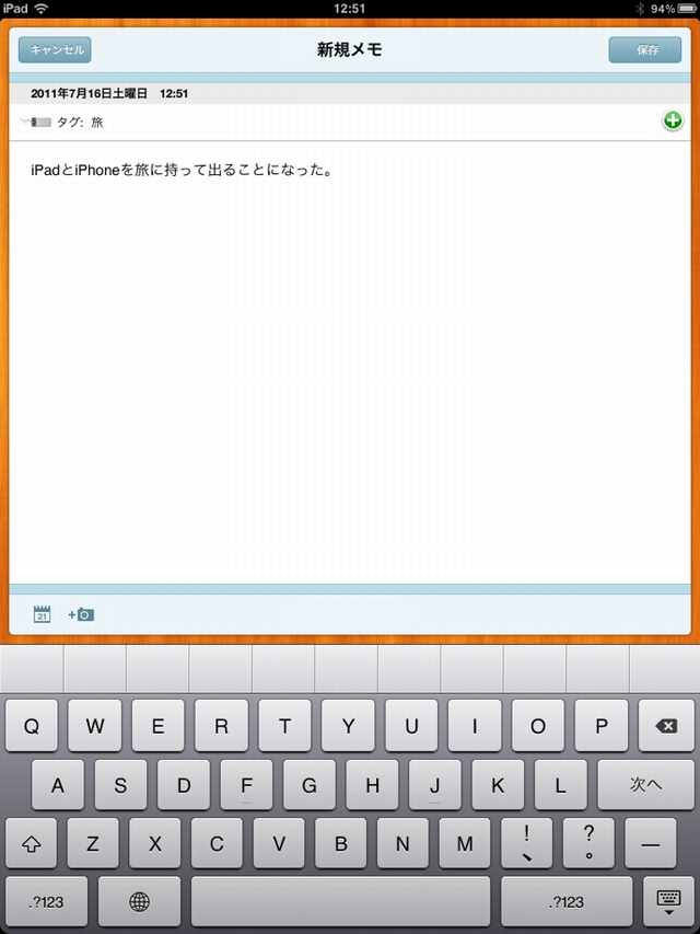 iPadでは新規メモを書くためには右下の「メモを書く」をタップします。メモにはメモを整理すためのタグを入力します。メモには写真も挿入できます。(1枚のみです)