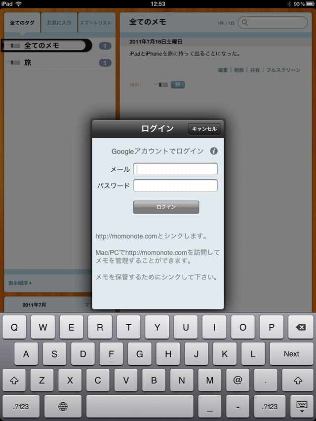 また、http://www.momonote.com/を通じて、他のiPhoneやiPadとテキストを同期することができます。このサイトの認証にはGoogleのアカウントを利用していますから、スタンドアロンで使うのでなければGoogleのアカウントを取得しなければなりません。