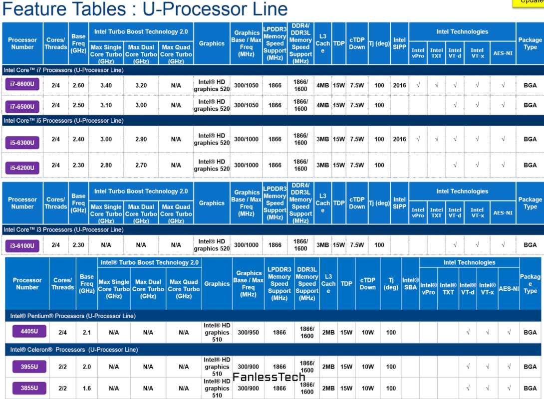 ✓ Core i7-6600U (2.6-3.4 GHz / 2C4T / HD Graphics 520 / vPro / 15W TDP)