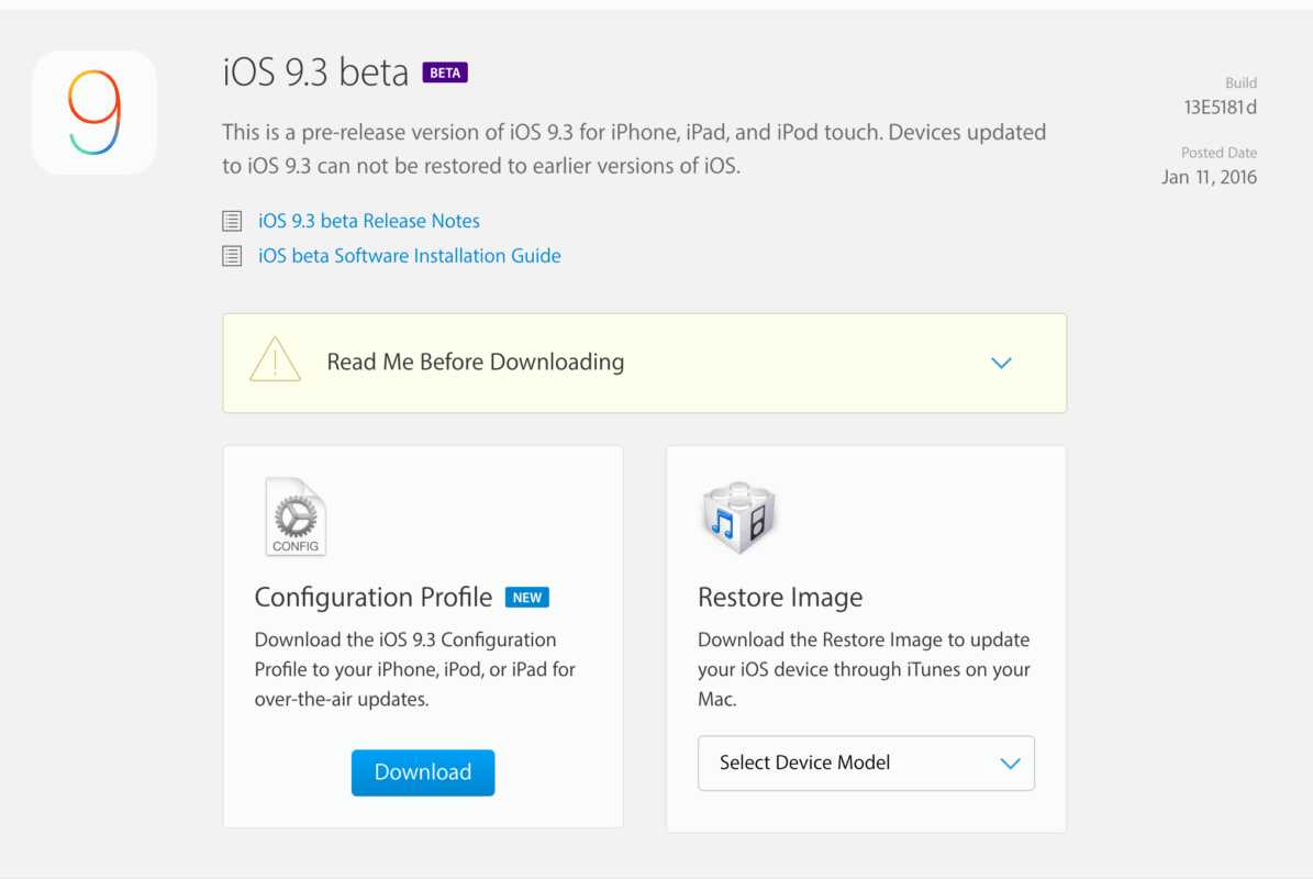iOS 9.3 betaの入手には、デベロッパーセンターにおいて、登録が必要です。