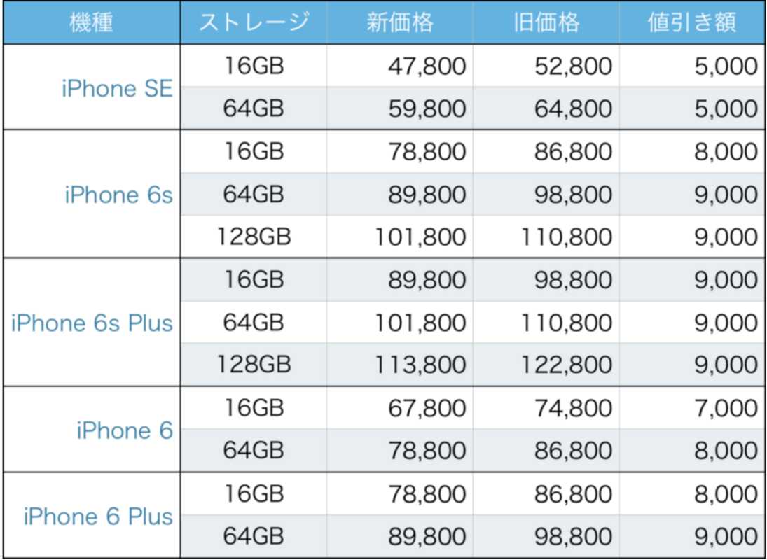 iPhone SEが、5,000値下げ、iPhone 6s / 6s Plusは、8,000円〜9,000円の値下げです。