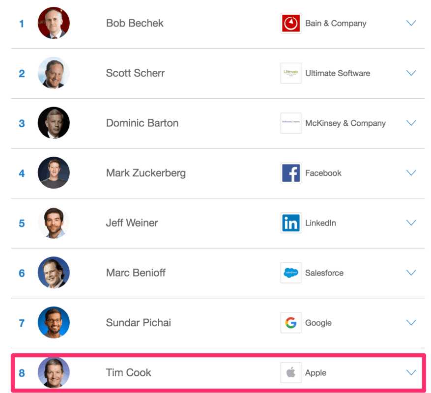 Glassdoorの年間最高CEO:Appleのティム・クック氏が8位にランキング!