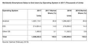 調査会社のGartnerが今日発表したデータによると、昨年(2017年)世界中で販売されたスマートフォンの99.9%は、AndroidやiOSをベースにしているとのことです。